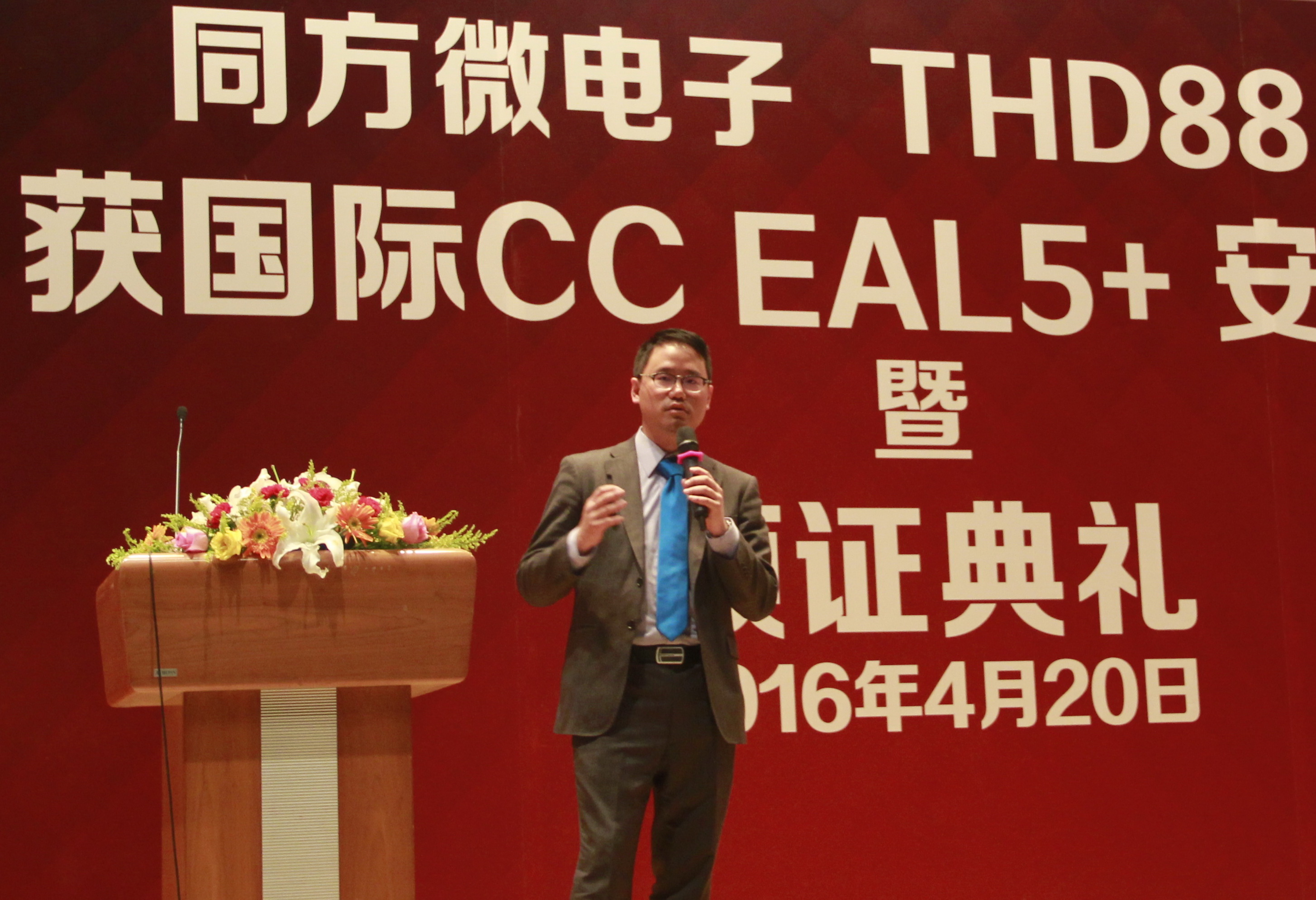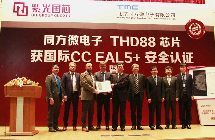 2016年4月20日,北京同方微电子有限公司(以下简称“同方微电子”)在北京清华同方科技广场C座国际报告厅召开CCEAL5+颁证典礼,挪威SERTIT安全认证部主任Kjartan正式向同方微电子总裁段立颁发了国际CCEAL5+安全认证证书,标志着公司自主研发的双界面金融IC卡芯片THD88/M2064(以下简称“THD88”)成为国内唯一一款获得该认证的芯片产品。紫光国芯股份有限公司(原名:同方国芯电子股份有限公司)领导、挪威SERTIT认证机构代表、荷兰Brightsight实验室代表、30多家合作伙伴代表、同方微电子公司全体员工共三百余人一起见证了这一历史时刻。